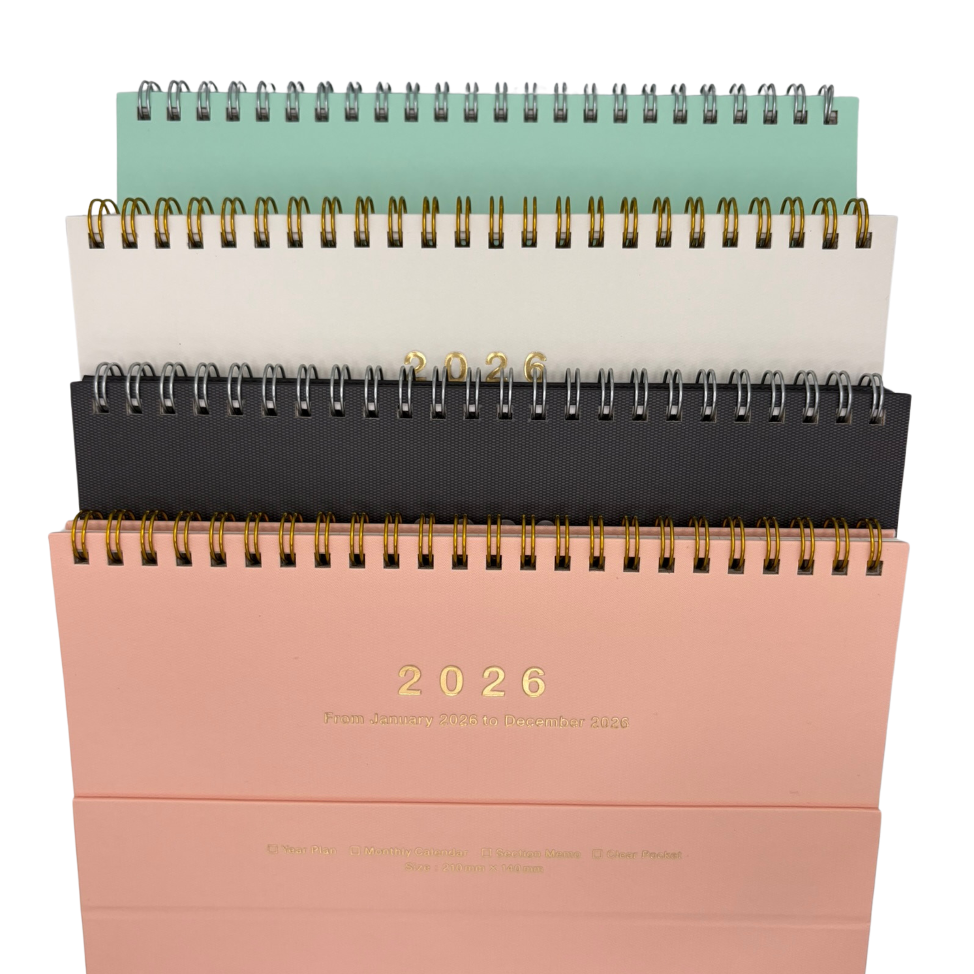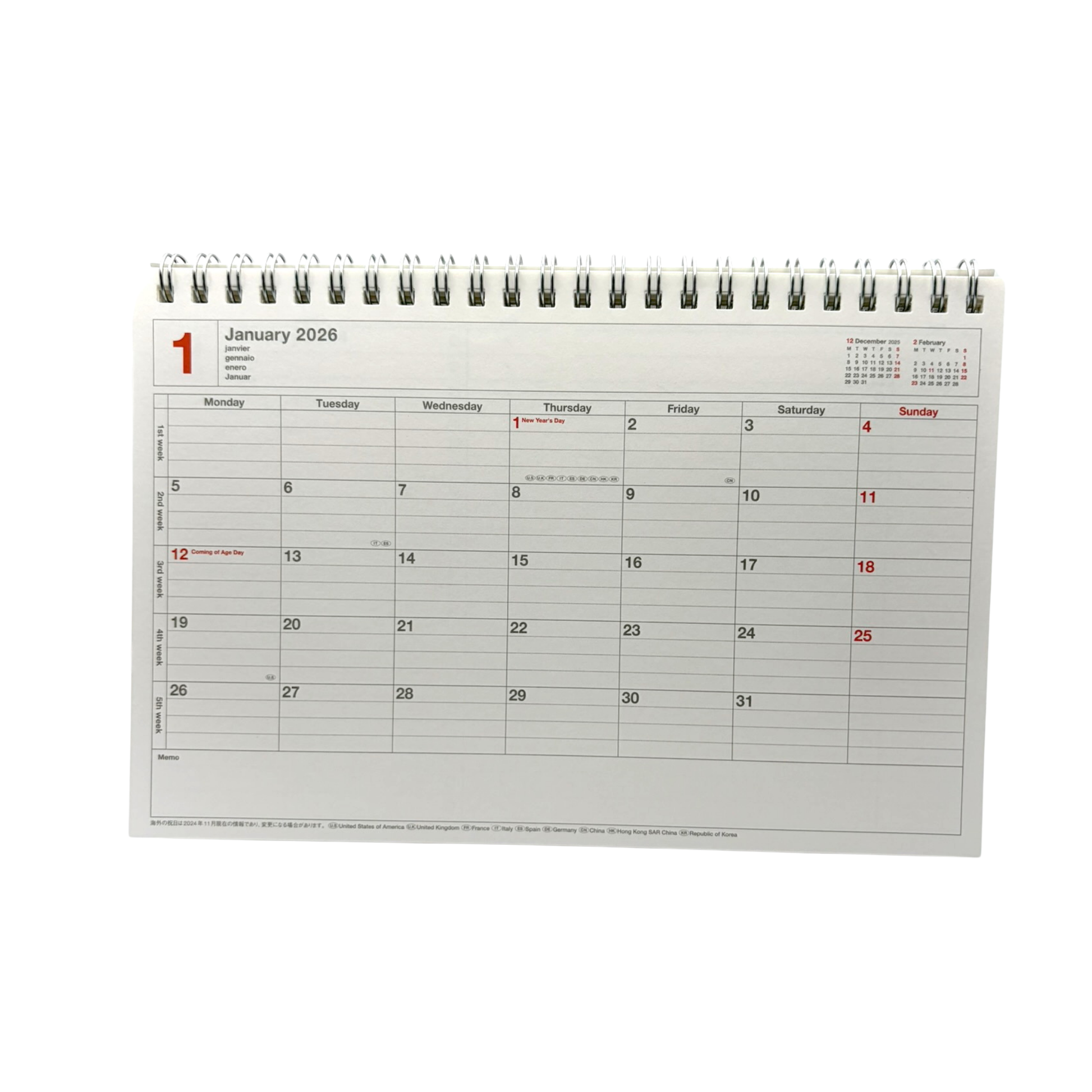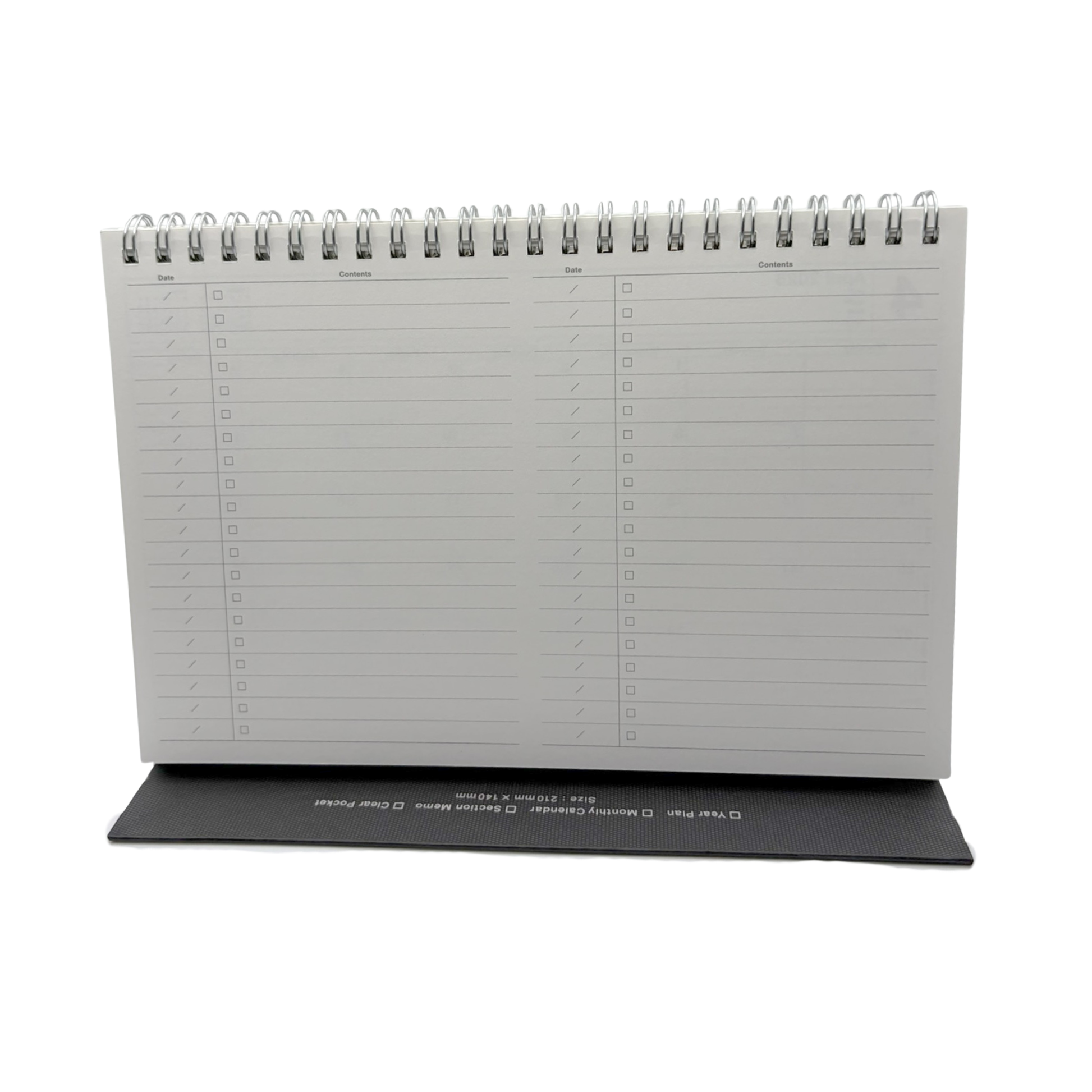 A high-quality notebook calendar loved for its practicality. A magnet-closure calendar that both stands upright for use on a desk and is easy to carry! Also contains grid paper and clear pockets in the back. Start month: January. Pages: 37 Pages. Made in Japan.
